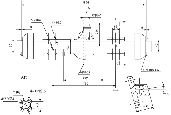 2.橋殼長度/殼可型式/截面尺寸:1258/整體鑄造式/ 110×110×8